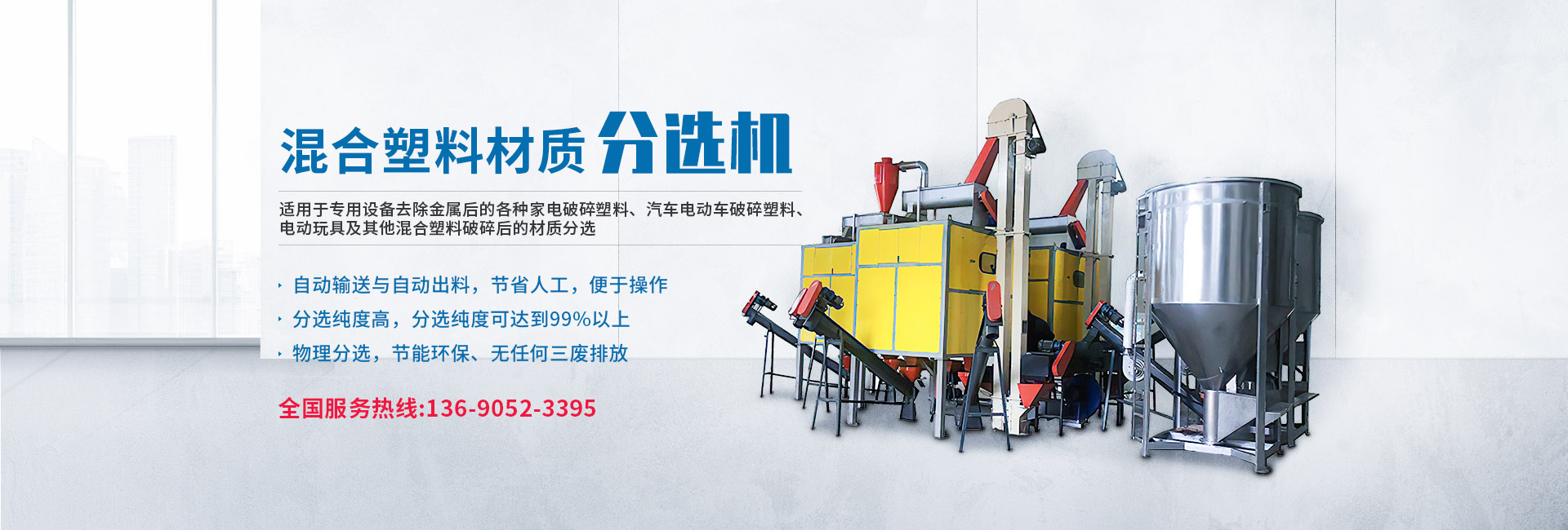 主要生產產品有:高壓靜電分選機(金屬非金屬),混合塑料高壓靜電材質分選機、渦電流分選機、空氣分選機、氣流比重分選機、硅膠橡膠與塑料分選機、電路板金屬回收設備、廢電線回收設備(銅米機)、廢舊鋁塑復合材料分選設備、銅鋁散熱器分離設備、鋰電池回收設備、電子垃圾與廢舊家電成套拆解與回收設備等再生資源設備的研發生產制作。